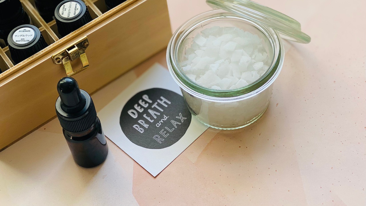 おすすめは、ユーカリとヒノキのブレンド。ユーカリのすっきりとした香りが頭をクリアにし、ヒノキのやわらかな木の香りが、心をしっとり落ち着かせてくれます。精油を直接お湯に入れると浮いてしまうので、天然塩やはちみつに混ぜてから溶かすとやさしく広がります。